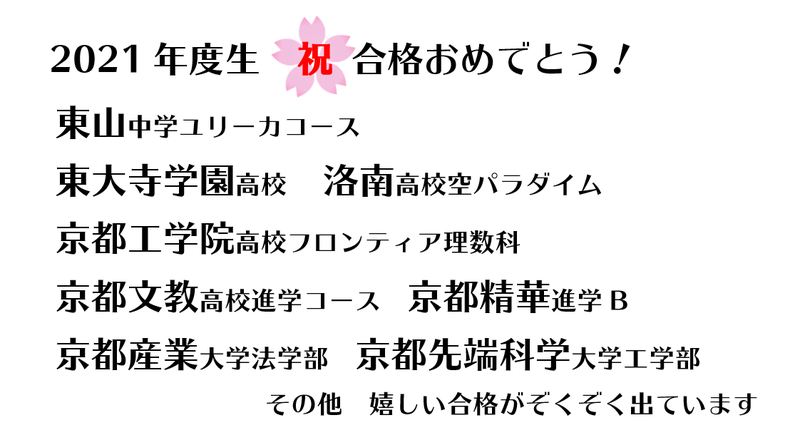 主な合格実績校:西京附属中学、京都教育大附属中学、同志社中学、立命館中学堀川高校探究科、嵯峨野高校こすもす科、西京高校エンタープライジング科、同志社高校、立命館高校メディカルサイエンス、洛南高校、東大寺学園高校、京都産業大学、龍谷大学、京都府立大学、京都工芸繊維大学、自治医科大学
